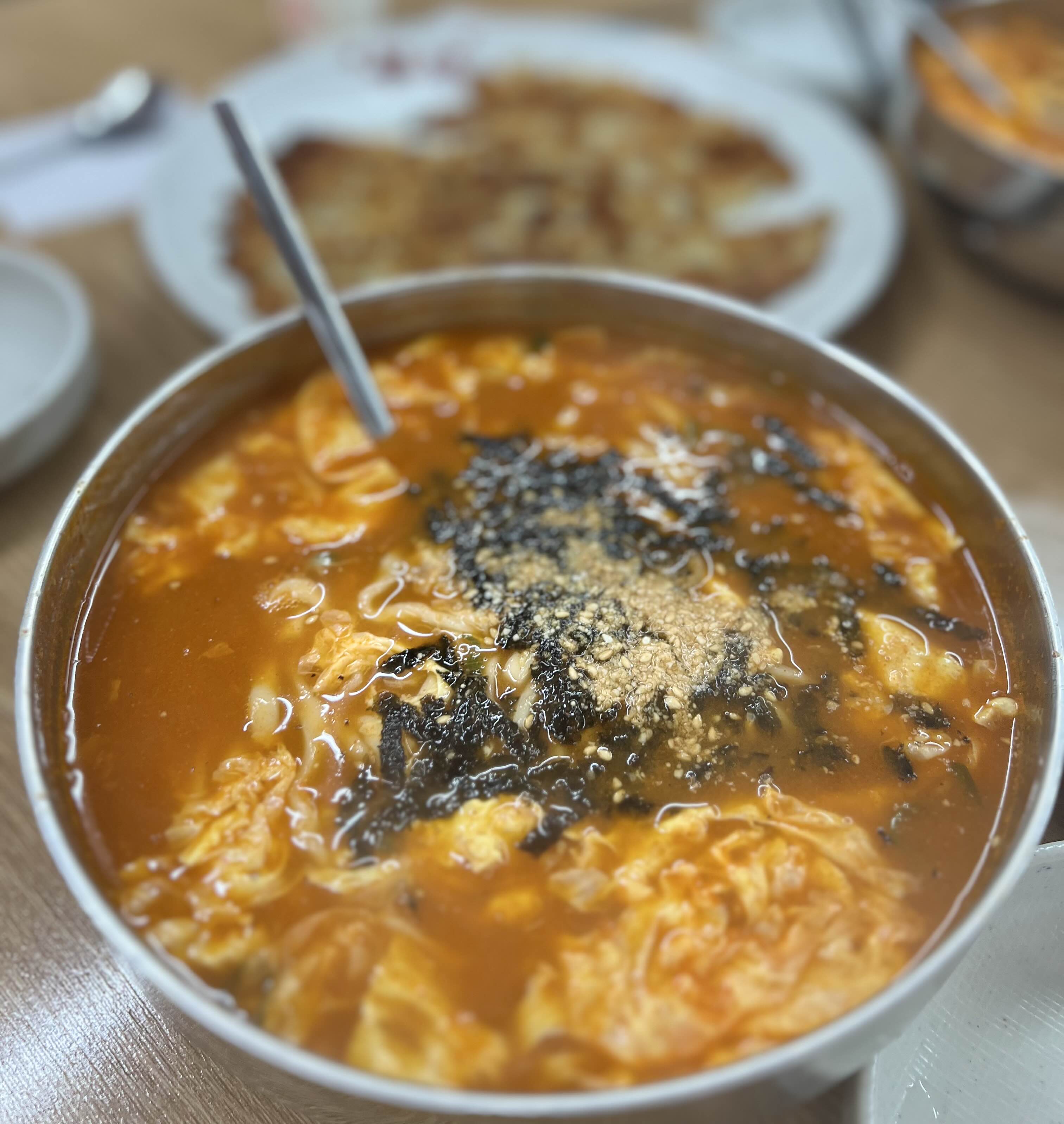 고추장과 된장이 섞인 듯한 국물은 칼칼하고 구수하며, 묵직한 감칠맛이 있다. 밀가루 냄새 없는 쫄깃한 면발이 뜨끈한 국물에 푹 잠겨 있고, 김가루와 깨, 계란이 부드럽게 풀려있어 한 입 한 입이 포근하다.