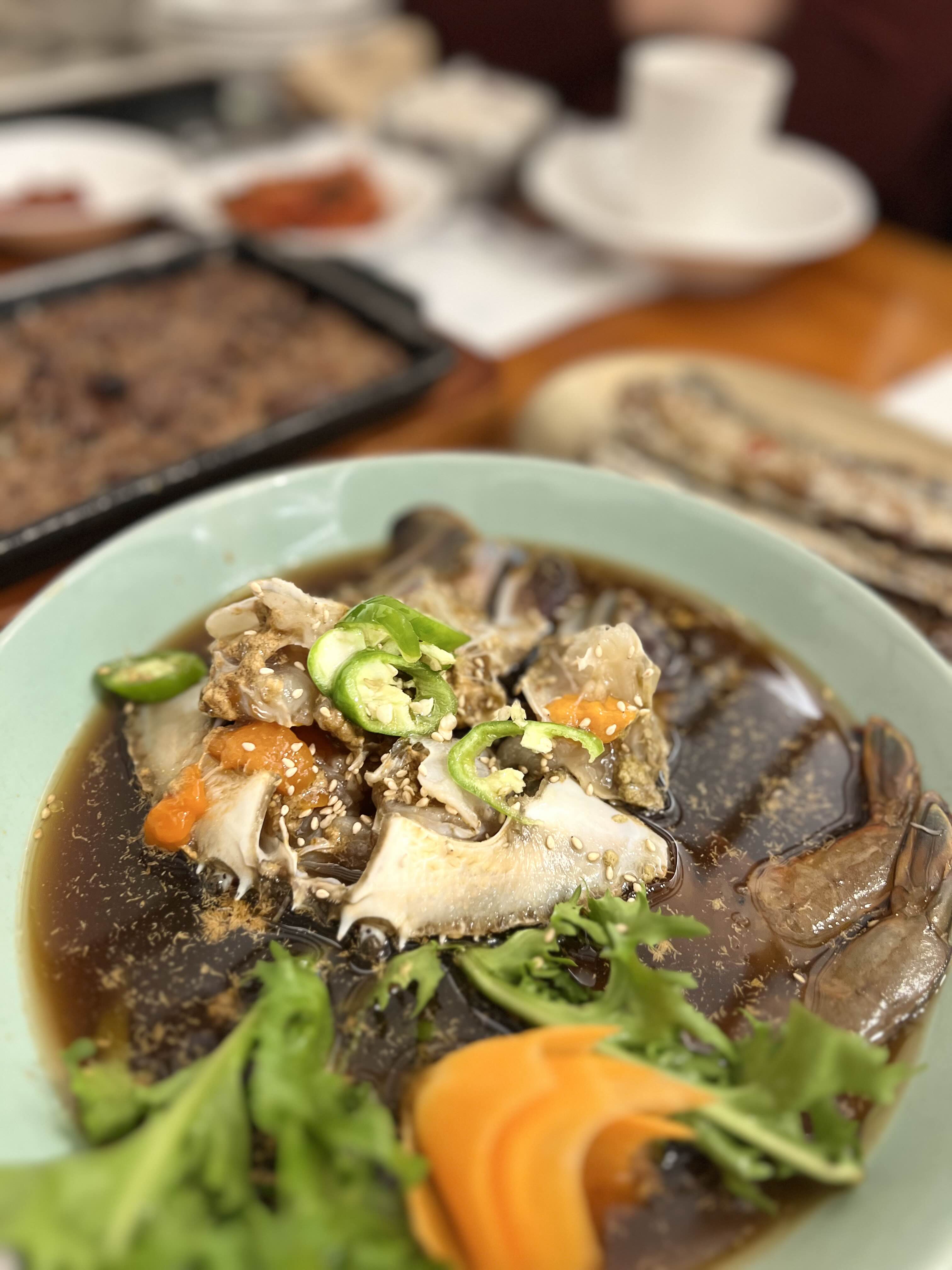 함께 제공되는 생대구탕 또는 우럭간국은 국물의 깊이가 인상적이다. 얼큰하거나 시원한 국물과 부드러운 생선살이 함께 어우러져, 메인 요리와 균형 있는 조화를 이룬다.